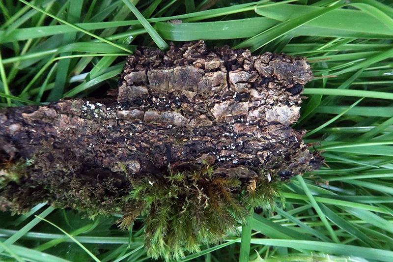 Un muy diminuto anamorfo fotografiado el pasado 9 de Junio brotando sobre una corteza de planifolio indeterminado, en soto fluvial.
