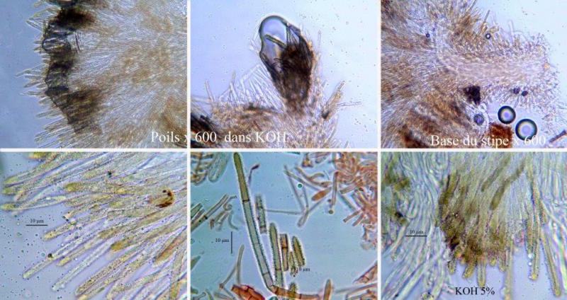 Poils 48,8 -109,4 x 3,2-4,2 µm, segments 15,5 x 3,5 µm, cylindriques, flexueux, 5 fois septés, jaune soufre, couverts d'ornementations abondantes, à la base du stipe poils plus courts, 17,9-26,3 x 3,5 µm, extrémités obtuses, noir pourpre dans KOH 3% sur exsiccata.
