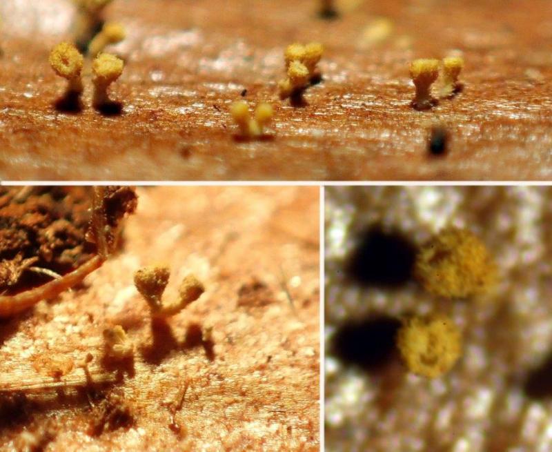 Stipe couvert de poils d'un jaune soufre, un peu plus clairs que la cupule, courts vers la base, 0,05 mm.