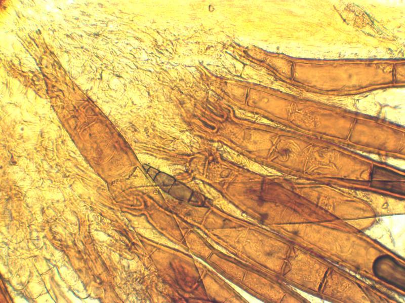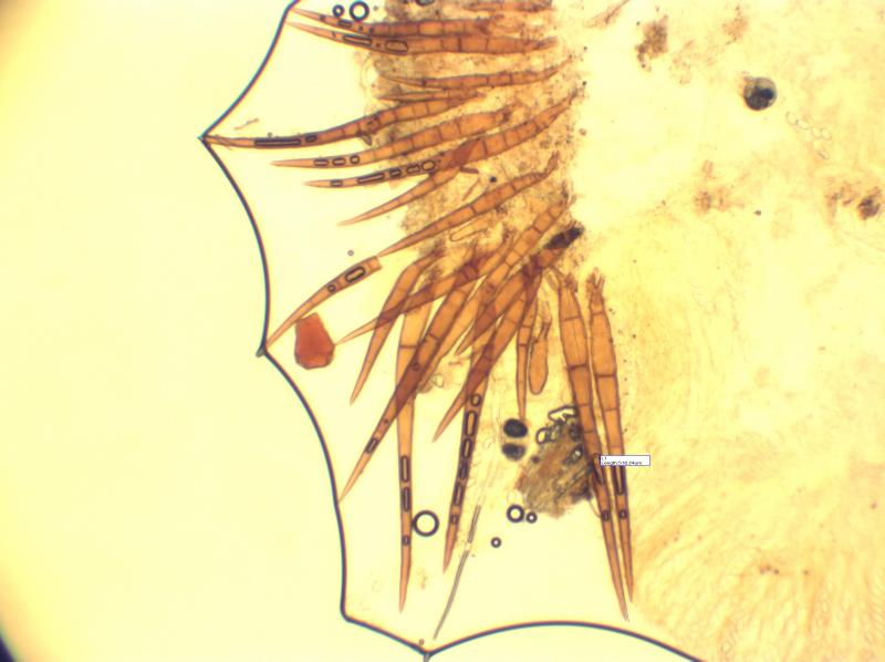 The spores were av 21.2 x 14.5 Q 1.46 with small/medium amoebic warts. The hairs were mostly up to 520 x 32 with an odd one up to 750.