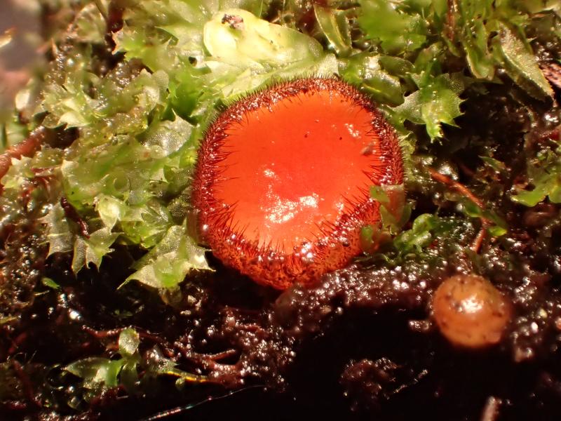 A group of Scutellinia on a moss covered fallen branch of probably salix in a boggy area alongside a pond.