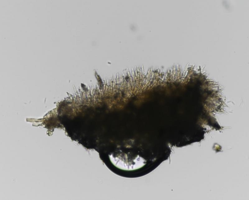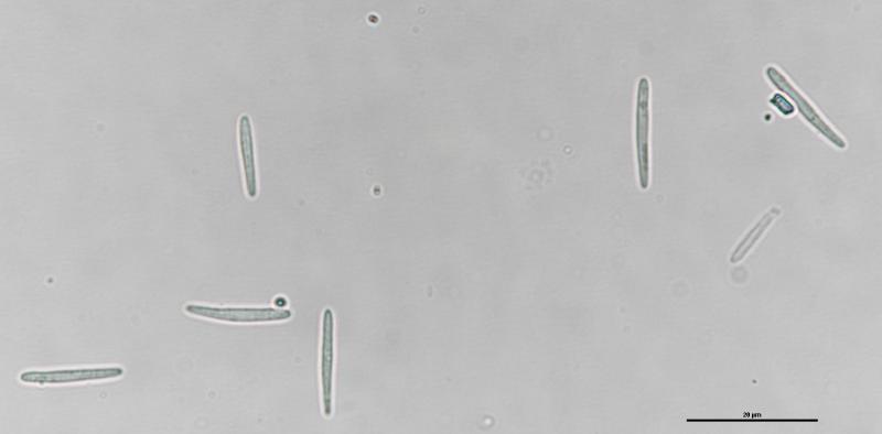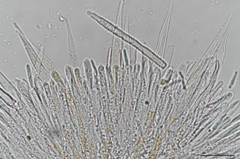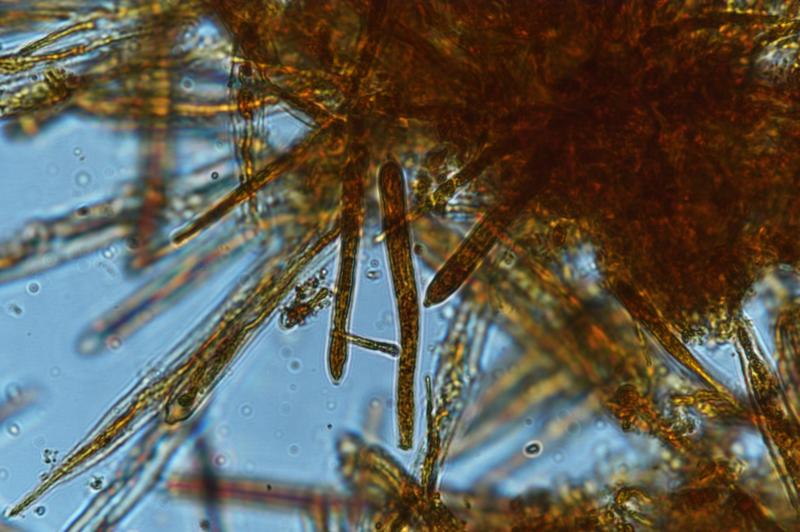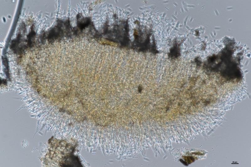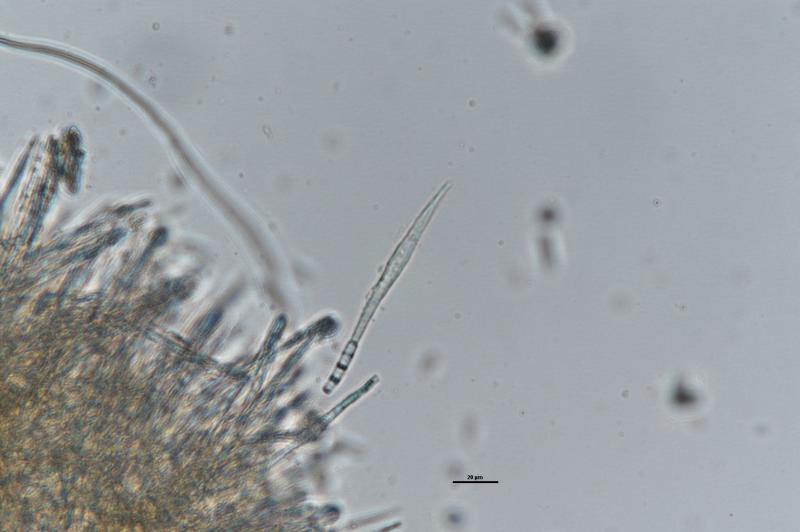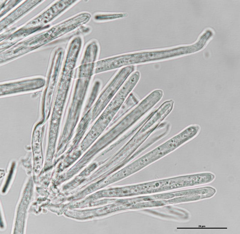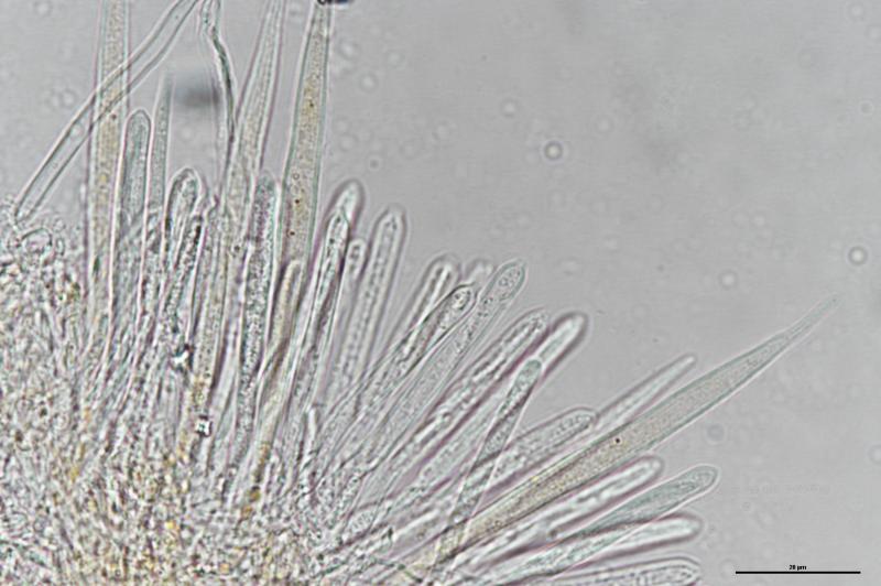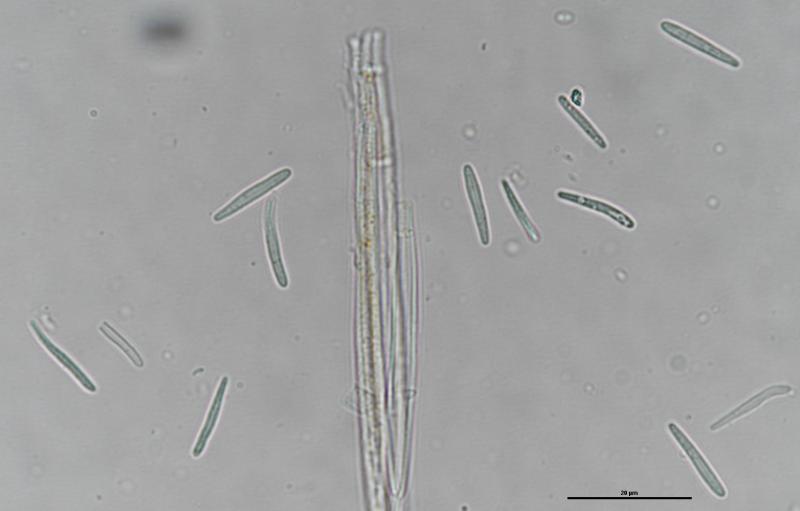 Largest apothecium is about 1mm wide. IKI +. Crozier -. Hair measurement around 111um long with no crystals. Some spores have one or two large oil drops, some have many small oil drops. Spore measurement: (13) 13.5 - 16.9 (19.1) × (1.9) 2 - 2.6 (2.8) µm
