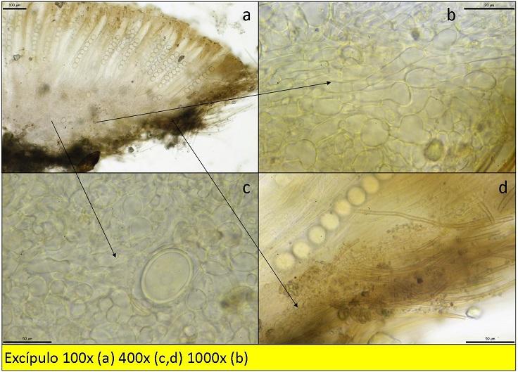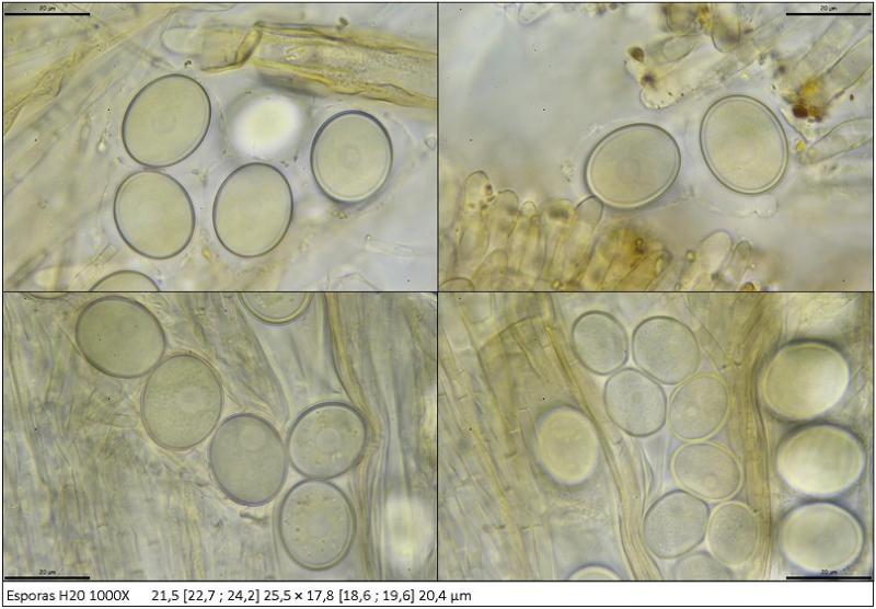 Esporas globosas cuando son inmaduras, después anchamente elipsoidales, con envoltura gelatinosa, de: 21,5 [22,7 ; 24,2] 25,5 × 17,8 [18,6 ; 19,6] 20,4 µm, medidas realizadas dentro de las ascas, de paredes gruesas, con un núcleo y granulaciones en su interior.