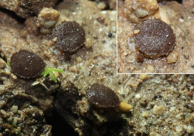 Apotecios más o menos turbinados, de hasta 2,5 mm, de color marrón/rojizo y mechones de pelos en la parte externa.