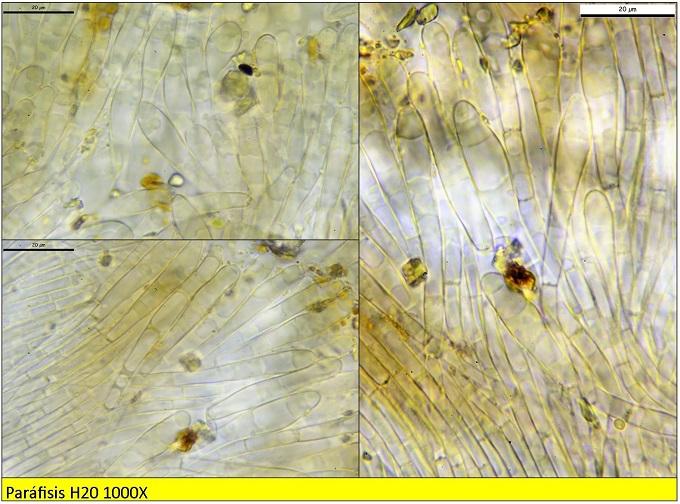 Paráfisis con grandes gutulas, con septos y ápice fuertemente engrosado