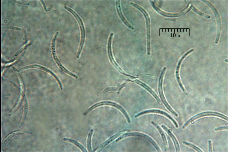 Microscopy: Conidia filiform, curved, abundant. Dimensions (measured across, not straightened): (16) 18 - 21.3 (21.5) × (1.1) 1.2 - 1.9 (2.1) µm; Q = (9.5) 9.7 - 14.6 (15.7); N = 13; Me = 18.9 × 1.6 µm; Qe = 12. Olympus CH20, NEA 100x/1.25, magnification 1.000 x, oil; in water; fresh material.
