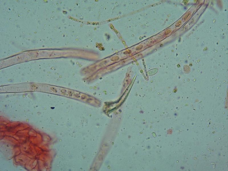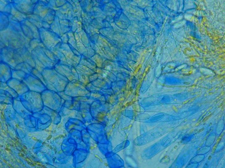 These discs (max.diameter 1 mm) were found on excrements of Galloway cattle. No hairs on margin or flanks. Spores showed no ornamentation in cotton blue / lactic acid. Free spores mounted in tap water measured 15.0-18.0 x 7.4-8.9 µm. Paraphyses with yellow guttuli and maximum width at the top of 5 µm. Textura of the excipulum consisting of large more or less globose to angular cells.