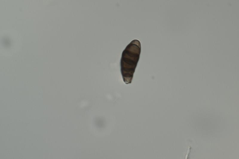 Ascospores, phragmospora when young starting with one septum, blue color, when mature 5 septa, dark brown cylindrical with hyaline apices, widening in the middle and with rounded apices.