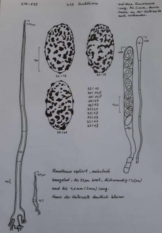 Spores have an ornamentation a bit comperable to S. scutellata, by confluent warts and plaques of different shape, but is coarser and higher as in S. scutellata. Hairs at the margin multifurcate and very long, up to 1600 (-2000 µm), whereas on the flanks they are remarkably shorter and only up to 150-200 µm. Attention: the measures for hair width has to be taken x2,5 (values were in 400x magnification ...)