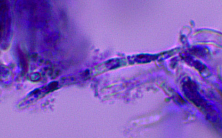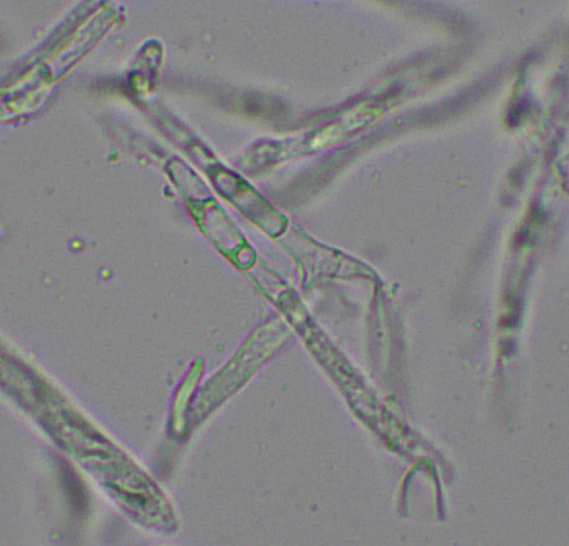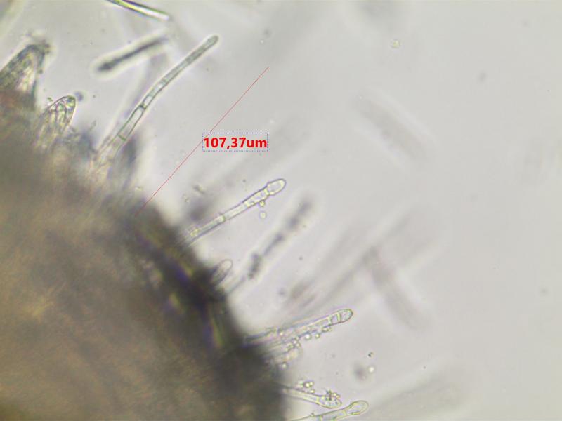 The apothecia were not fully ripe and its hairs were agglutinated with amorphous crystals to large extent. The few free spores (quite moving in the slide) were about 5-7/1,5-2 µn large. Paraphyses are filiform and with some guttule content. The asci are (some ..) 8-spored, and I did not find croziers. With Barals solution they react faintlly bluish (hardly to get in the picture). The excipulum is of textura angularis-prismatica, the end-cells (as they could be observed) are about 20-35/3-4 µm long and brownish, they bear protuberances similar to Mollisina but shorter.
