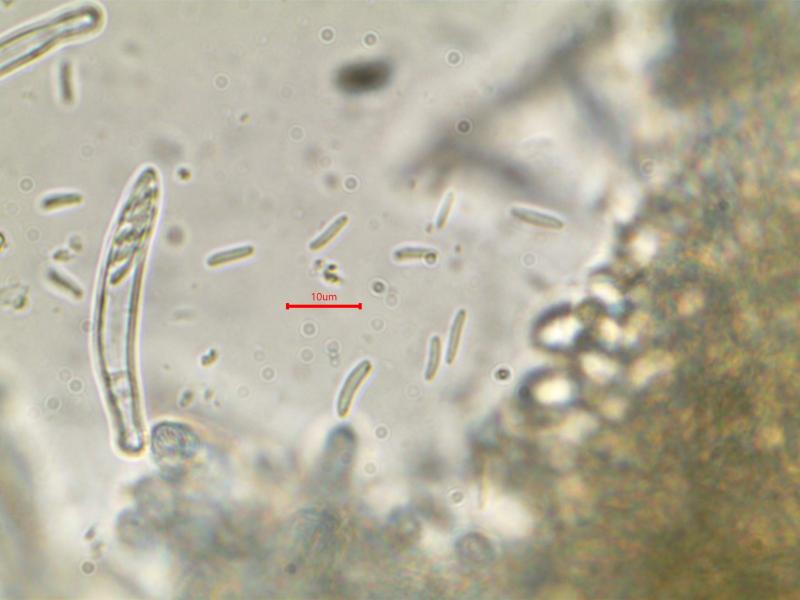 Different references give different spore size ranges for M. lagenaria, and if anything our spores seem small by comparison. Our collection would appear to constitute a range extension for M. lagenaria, if it can indeed be said to be that sp.. Is there another possibility?