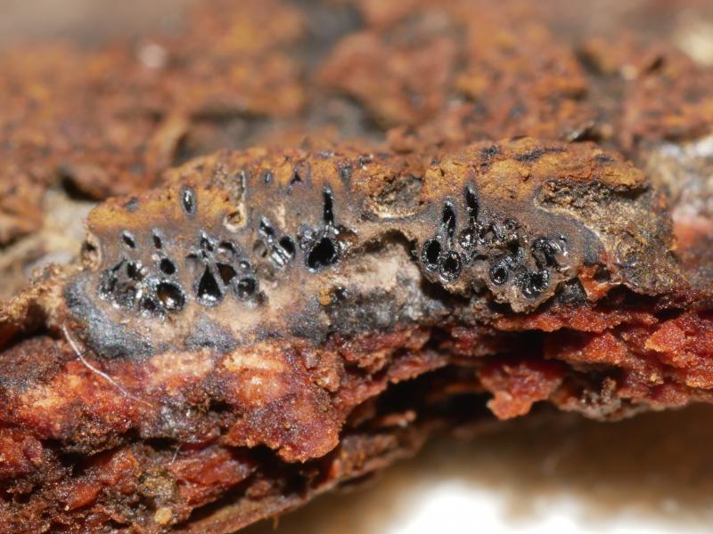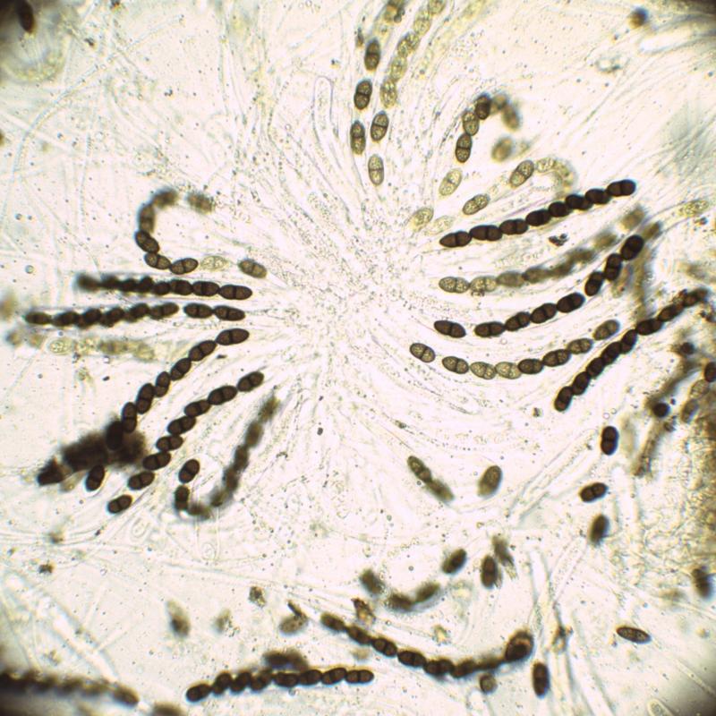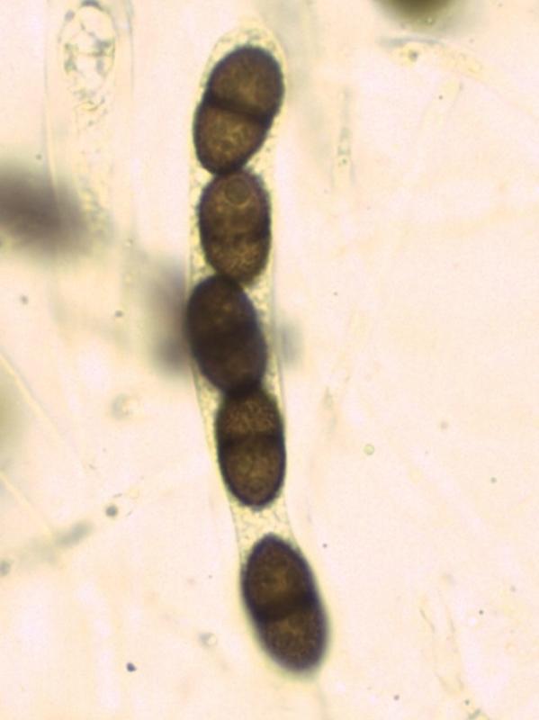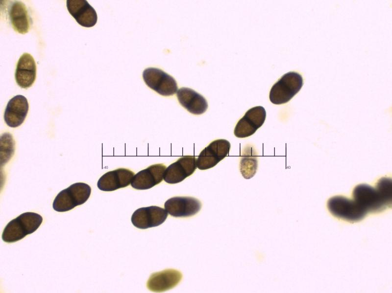 Apothécies de diamètre 0,5 mm environ, érompantes. Hyménium orangé, marge brune épaisse contrastant, rarement dentée. Excipulum à cellules à paroi épaisse, paraissant gélifiée, couche externe ambrée. Asques cylindracés à fusiformes, 68-100 x 18-28 µm, emplis par les spores parallèles, inertes dans IKI, mais la paroi des jeunes asques se colore en bleu dans KOH + IKI. Nombre de spores par asque difficile à évaluer. Paraphyses cylindriques, de diamètre jusqu'à 2 µm, tortueuses, septées, contenant des petites gouttes jaune orangé. Spores longuement fusiformes avec les 2 extrémités acuminées, contenant de nombreuses petites guttules, septées (7 à 14 cloisons, le plus souvent 13), (33)55-82 x 3-4 µm, avec une très légère constriction au niveau des cloisons, plus marquée sur la cloison centrale. On voit parfois des spores brisées en 2 au niveau de la cloison centrale.