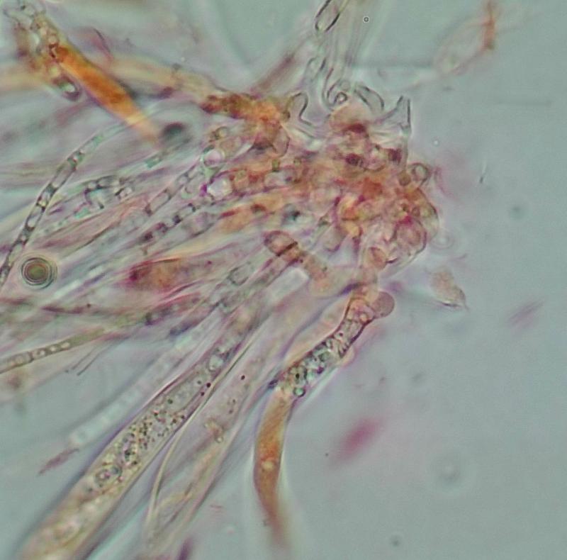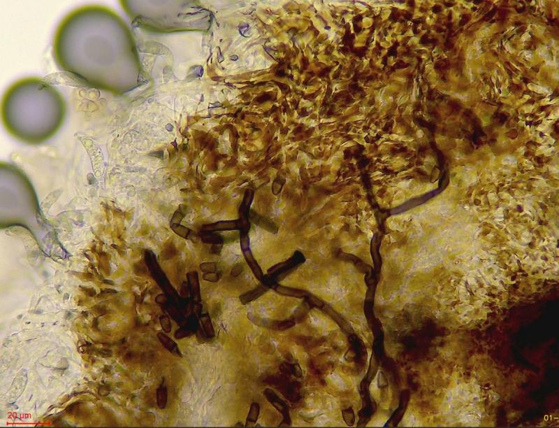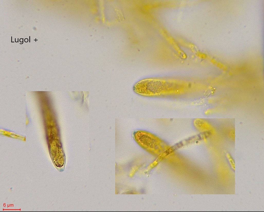 Le bois était imbu, mais il n'y avait que quelques exemplaires. Les apothécies étaient inférieures aà 1 mm, Leptodontidium trabinellum semble convenir, la réaction au Lugol semble être rb dans le cas de mon étude, c'est le seul point qui me semble discutable.