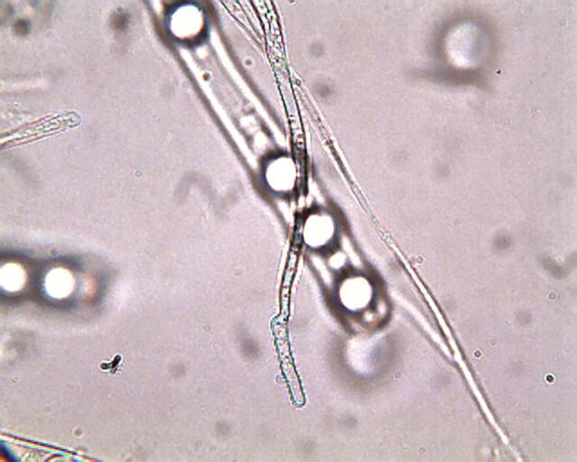 Spores are small fusiform and quite small usually with one or two oil drops at each end, measuring: