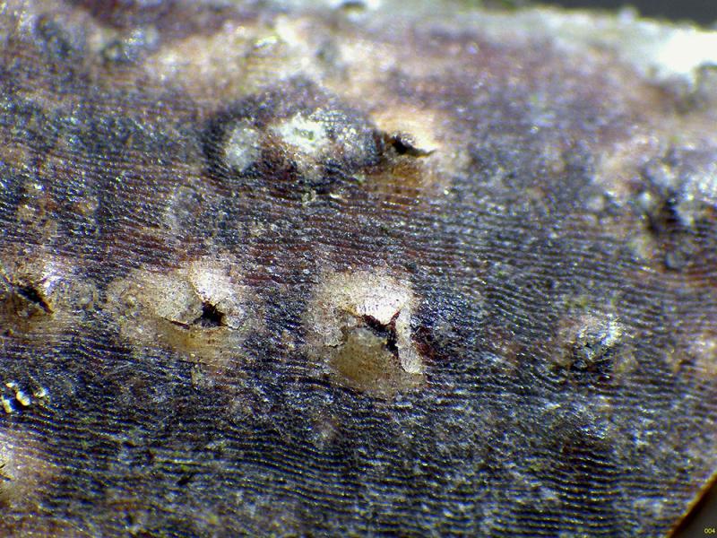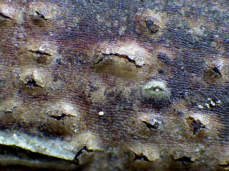 A tiny ascomycete, appearing as erupting grains, barely embedded in the substrate, blackish in color, sprouting sparsely but massively from decomposing soil stems of Rubus sp.