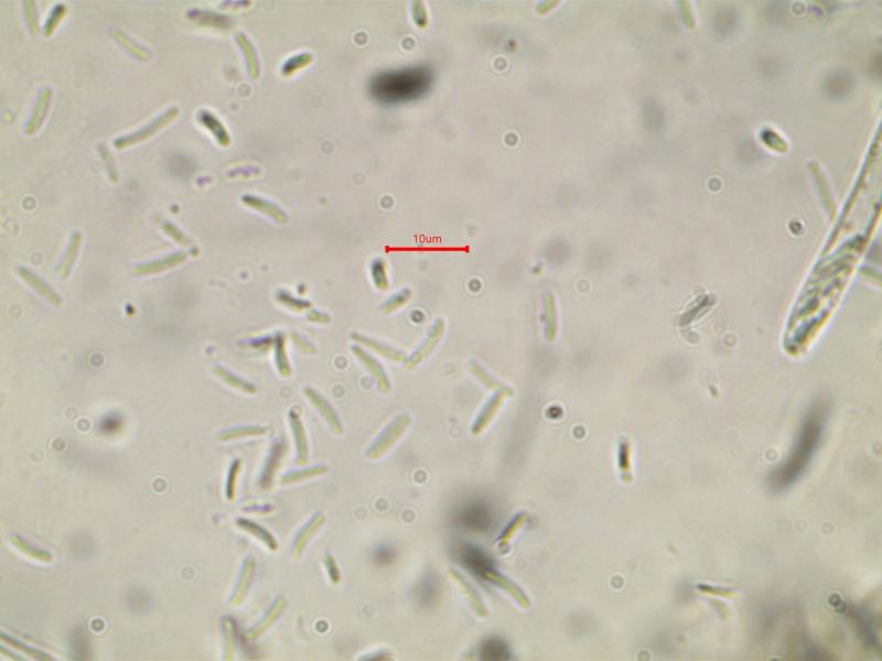 Of what I believe are two distinct ophiostomatoid fungi shown, the larger of them is the target organism, and it is spores from this fungus which are shown in the micrographs and in the measurements below.