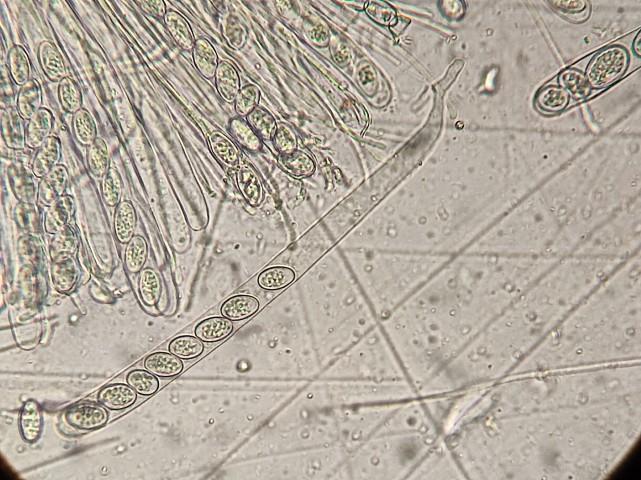 récolte réalisée en milieu dunaire, apothécies 15 mm maximum, spores 16,5-18 x 10-10,2 µm.