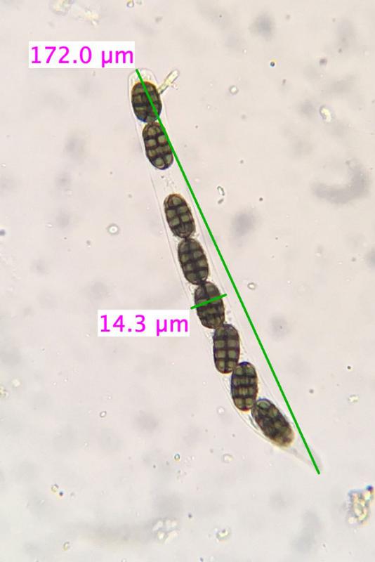 Les asques, IKI+, font 275-361 x 13.8-18.6 µm