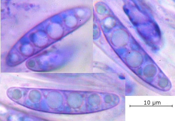 Asci bitunicate, 8-spored, 200-250um, spores 1-seriate. IKI- with a high refractive apical aparatus (violet in CRB, disapear in KOH)