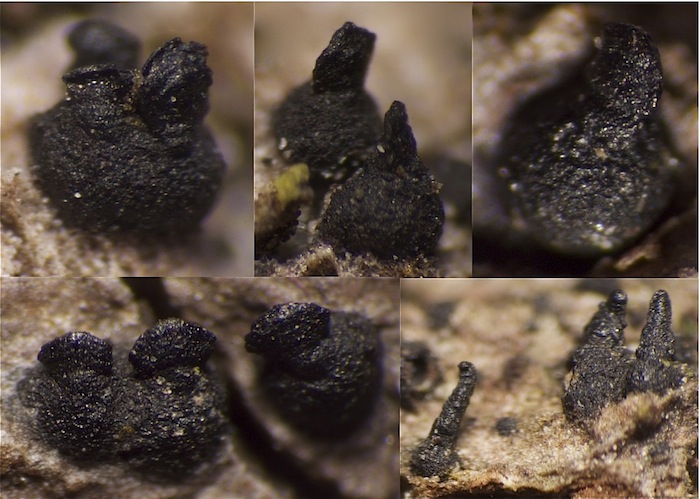 here I have a second indeterminate pyreno which grew on the bark of a living Fraxinus. The ascomata are very conspicuous because they can be from Navicella-like with a small, slit-shaped neck to even Ceratostomella-like with a long and thin neck (I checked that they really are of the same species). The spores are 22,5-25 x 8-9 µm, mature always 4-celled and slightly rough, often with two paler end-cells. The asci are bitunicate and 8-spored. I didn't find a species within the Lophiostomataceae which would fit with my species.