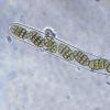 Spores are oval with rounded tips, light olivebrown, muriforme septated with 3 horizontal septa and 1 mostly incomplete vertical septum, 16.5-20x7.7-10.4 µm (no "free" spores observed).