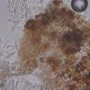 Apothécies d'abord presque sphériques, s'ouvrant ensuite, sessiles mais épigées, ~ 0.3 mm, ext. brun-rouge sombre du fait d'incrustations brun rougeâtre amorphes surtout abondantes vers la marge, hyménium d'abord briqueté par transparence mais en fait hyalin, concave puis plan. Marge semblant légèrement déchirée, présentant des poils courts.
