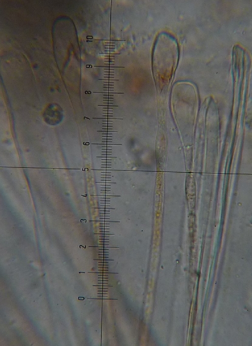 Alors, ce n'est qu'allégation, mais je penche fortement au vu des quelques données que cette collection est très proche de S. crinita. Les points gênants sont la base des poils que tu donnes mono à bifurquée et l'ornementation qu'il faudrait voir mieux ainsi que d'autres critères micro à vérifier (marge pubescente présente ?, forme du sommet des paraphyses ?, base des asques ?...)