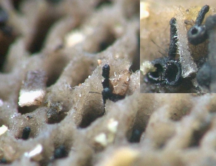 Substrate: on old, wet and rotten Trametes gibbosa (at Fagus sylvatica). Trametes gibbosa is blueing in some areas (due to this fungus?).