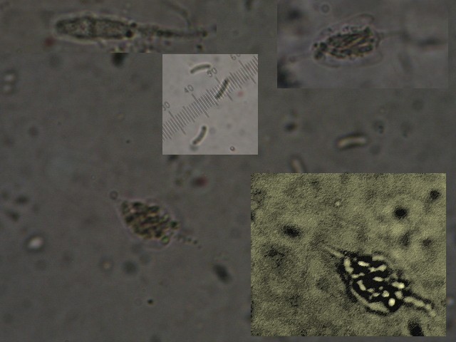 Les spores allantoïdes mesurent 6-7x1-1.5µ. Ce sont les asques (de 40µ environ) qui me posent problème avec leur anneau important un peu comme Eutypa archarii, avec spores bisériées. Mes photos sont floues pour avoir voulu mettre en évidence le contour de l'asque marquant cet anneau.