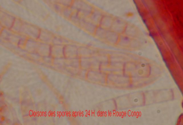Dans le prolongement de notre discussion, je me suis aperçu qu'en laissant la préparation dans le rouge congo 24 heures, on apercevait alors nettement les cloisons, comme le montre le fragment de photo joint.