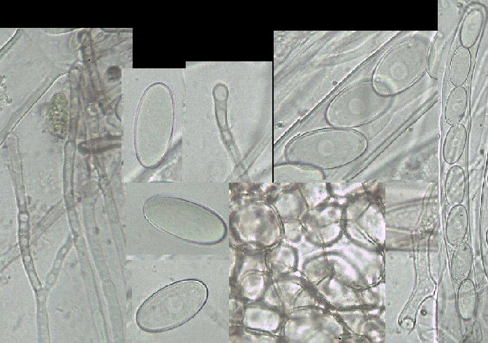 Spores: elliptical, 30-35 x 15-16,5, each with a weak but significant guttule (ca. 4 ym) in the centre.