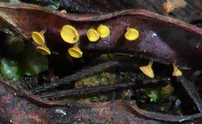 When I found the yellow one two days ago, in the vicinity there were also brown apothecia (on Rubus and Eucalyptus) which likely were M. lentus s.l., too. I did not notice the swollen yellow cells there, too.