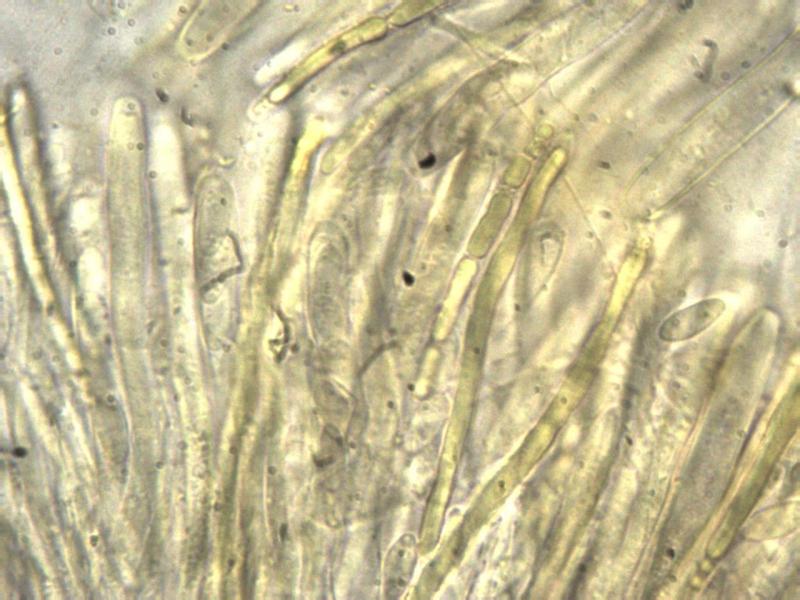 I find the swollen end-cells of the excipulum with bright yellow vacuolor content very striking. Does M. lentus have such? I do not remember that at all.