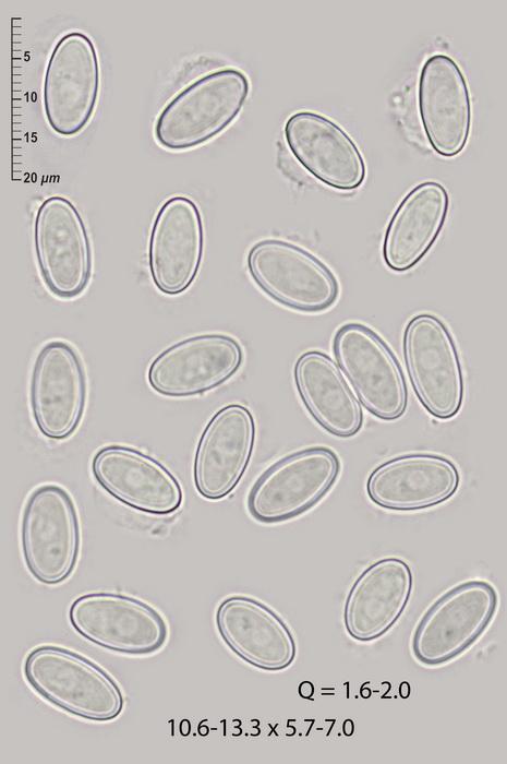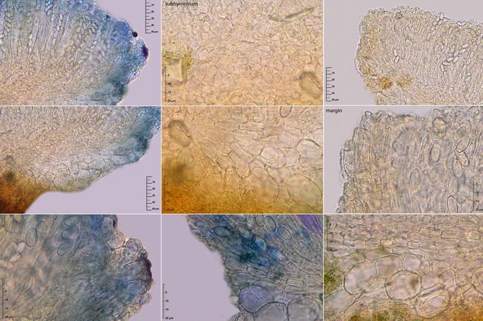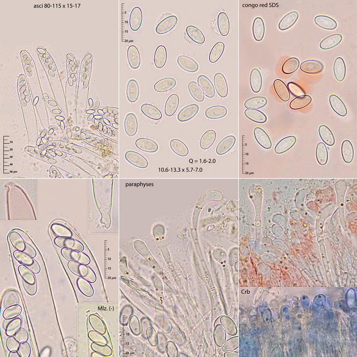 These minute, pulvinate, broadly sessile, pale orange apothecia, 0.2-0.5 mm in diam., were growing on roe deer dung placed in moist chamber during several weeks. The carotenoid pigments are obvious as small orange guttules at the lower cells of the paraphyses and in the not dextrinoid, not cianophilic excipulum of a textura globulosa to angularis, more prismatica towards the flanks, with clavate cells (paraphyses-like) at the margin.