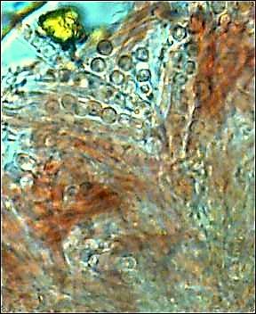 Spores rondes à contenu vaguement spumeux, lisses, hyalines, 3-4 µm de diamètre.