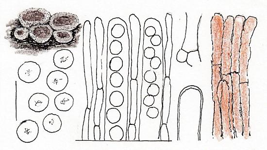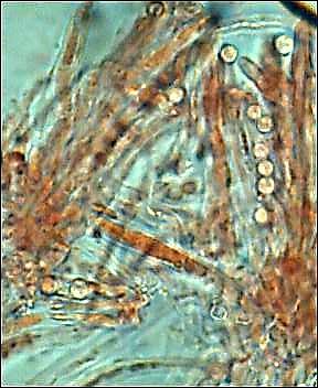 Asques 30-45 x 5-6, crochets +, IKI -, contenat huit spores d'abord en quinconce puis unisériées.