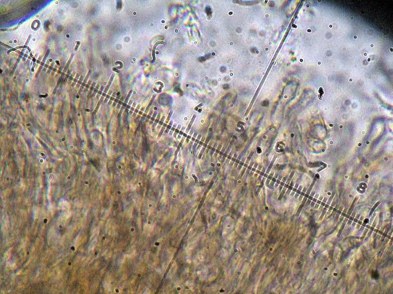 Pas de poils à crochet sur la marge ou l'excipulum mais cellule brunes, parallèles, un peu rnflées au sommet, vaguement granuleuses. Je joind quelques photos dont une de la marge (assez mauvaise...)