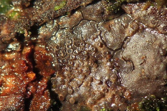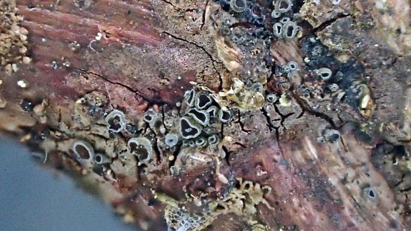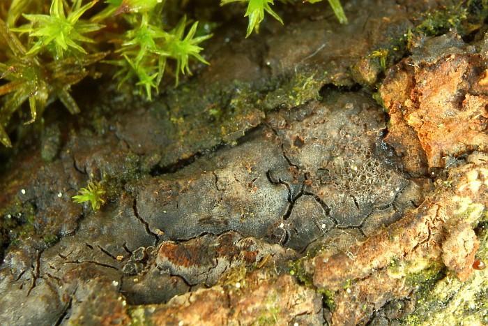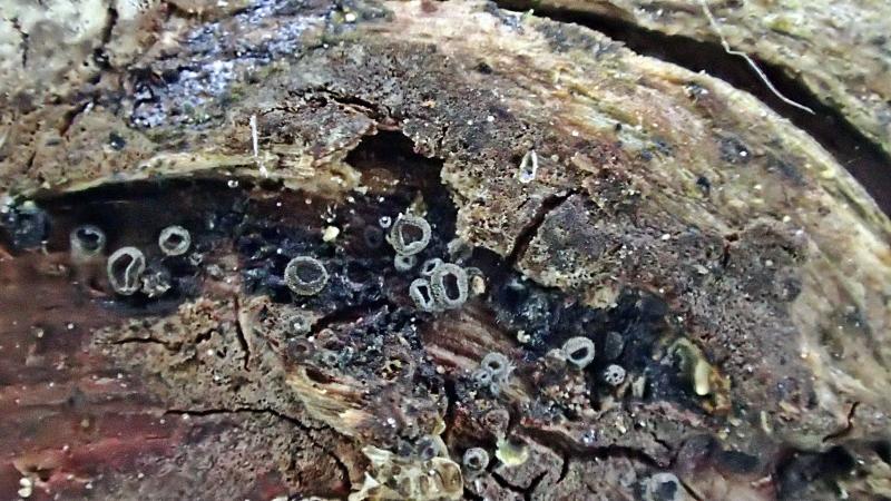 Apothécies grégaires, sessiles, à marge restant un peu enroulée, 0,5 mm de diamètre. Hyménium brun châtain. Marge et surface externe paraissant plus clairs, comme poudrévelouté.