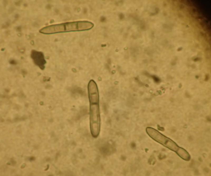Spores 25 - 35 x 6 - 8 my.