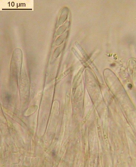 Paraphyses filiformes, cylindriques, jaunâtres en NaCl iso., non septées,1-2 par pied, parfois ramifiées, contenant de nombreuses guttules, dépassant légèrement les asques