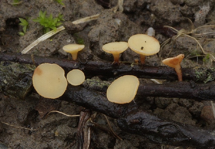 Cf. picture. Apothecia scutellate, up to 5 mm diameter, pale yellow, reddening, stalked up to 4 mm. Asci 110-130x8-10 um, arising from croziers, IKI- (My Lugol is new!!!). Spores 0(1)-septate, 15-18x5,1-5,8 um, Q=2,6-3,4 , with many guttules up to 1µm diameter. Paraphyses filled with strongly refractive guttules. Paraphyses up to 3-4 um wide.