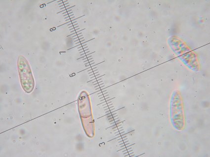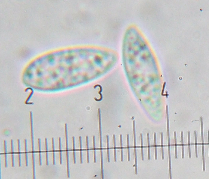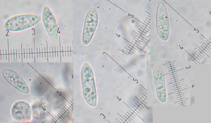 Spores cylindriques , lisses, hyalines, avec de nombreuses guttules allant jusqu'à 1 um de diamètre, 15-18x5,1-5,8 um, Q=2,6-3,4. Avec parfois 1 cloison