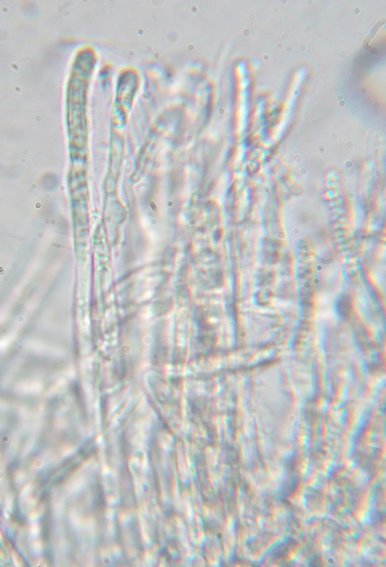 Paraphyses cylindriques, parfois un peu irrégulières ("cabossées"), septées (au moins deux cloisons), larges de 3-4 um, dernier article rempli de guttules.