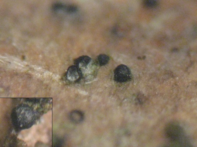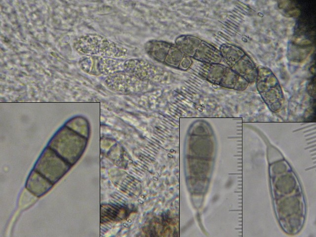 Des petits périthèces noirs subglobuleux, plus larges que hauts (enivron 300µm). Spores typiques ; description voir photo : la partie brune composée de cellules à grosse guttule mesure environ 20x6-7µm, cellule apicale plus claire, la partie hyaline (une cellule de 4-5µm) prolongée d'une queue de 6-8µm.