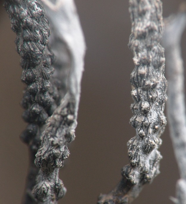 Stromata gregarious, unbranched, clavata narrow cylindric, 25-55 x 0,5-1 mm with sterile apices; stipe distinct, smooth, half of the clavata; subiculum sparseley setose, brown; perithecia , evident, globose, ostioles papillate