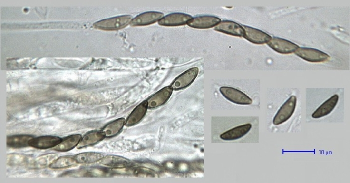 Ascospores brown, germ slit straight, with hyalin appendage, elliptic to navicular with narrow ends, 10-11,5(13) x 4-4,8 μm (appendage: 1,5-2 x 1 μm)