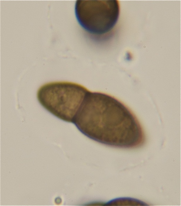 Yesterday I found this one. Spores: 26-27 x 9-10 µm, are brown, two-celled and one half is smaller than the other. It grew on old wood of a deciduous tree.