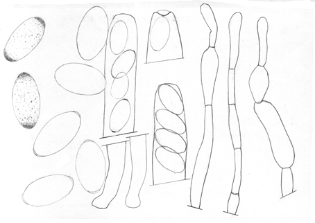 15,5 X 7,5 µm elliptiques légèrement fusiformes mais dans certains asques devenaient enflées polyédriques et même difformes, toujours avec grosses guttules (notées dimensions jusqu'à 18 X 11 µm mais surement plus )