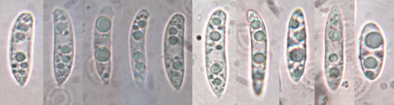 Spores are hyaline, multi-guttulate usually with 2-4 larger guttules and several smaller ones, some curved, many with one blunt end and one acute end. Dimensions: