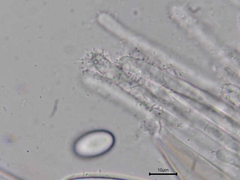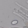 I suspect those are bacteria. It's interesting that they are attached to paraphyses like that.